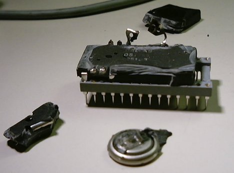 After the smoke has left, :o) I discovered that the base of the DS1287 was in fact a DS1285 circuit where Mr Dallas had glued a little battery . Some pins were folded inside the cover for the connections.